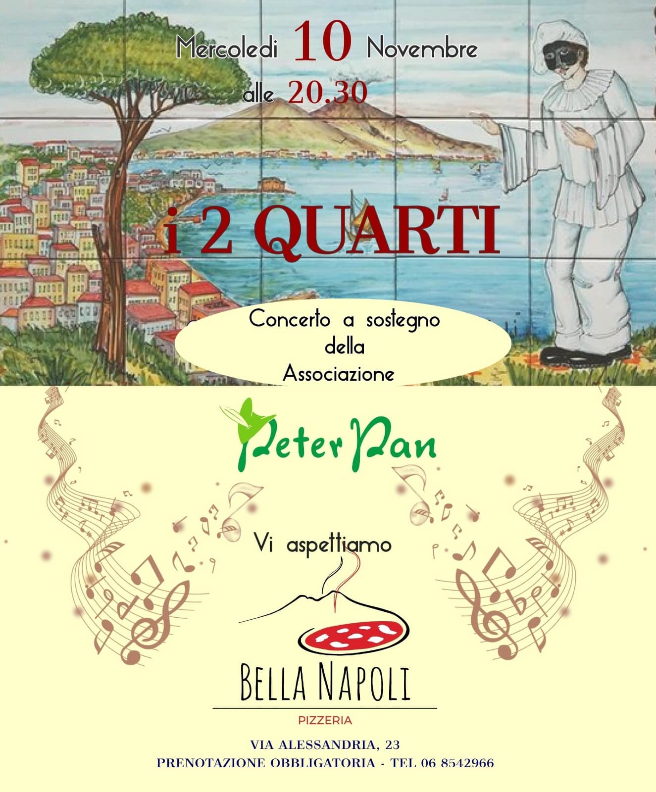 Torna la musica dei “2 Quarti” a sostegno dei bambini malati di cancro ospiti della Grande Casa di Peter Pan. I nostri amici vi aspettano a Roma il 10 novembre prossimo presso la pizzeria “Bella Napoli” in via Alessandria 23. Il concerto inizierà alle 20.30. La prenotazione è obbligatoria al numero 06.8542966.