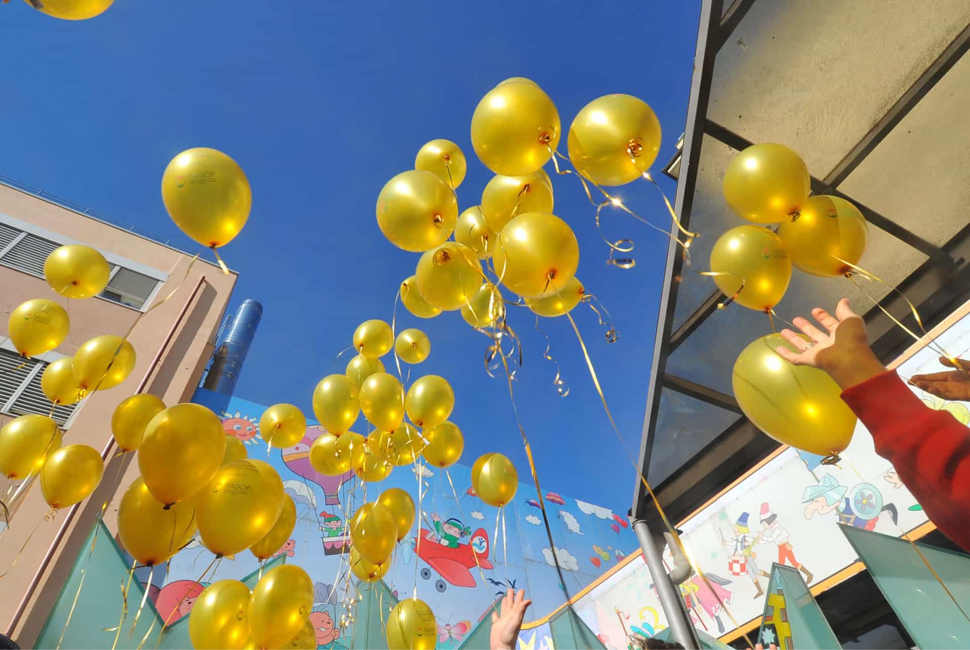 Poco dopo il suo intervento, dalla ludoteca del “Bambino Gesù“, insieme a medici, infermieri, piccoli pazienti e famiglie abbiamo lanciato nel cielo tantissimi palloncini d’oro, un’azione simbolica effettuata in contemporanea in tutta Italia per chiedere  cure mirate, assistenza, speranza per tutti, supporto alle famiglie riconoscimento del coraggio, della forza e dell’eroismo di tutti i bambini malati di cancro.