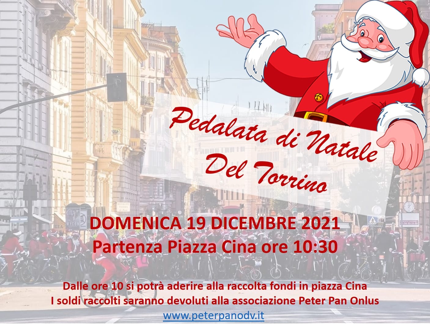 Una nuova Pedalata di Natale a Roma a sostegno di Peter Pan arriva nel quartiere Torrino della Capitale. L’appuntamento è in piazza Cina dalle 10. La partenza in bici è prevista alle 10:30. La Pedalata non è una corsa competitiva, è quindi aperta a tutti e tutte. La partecipazione è libera. Durante la manifestazione saranno raccolte donazioni a sostegno die bambini malati di cancro ospiti della Grande Casa di Peter Pan.