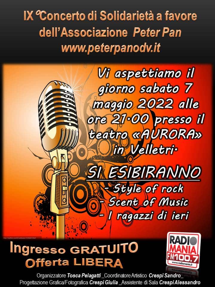 Che a Velletri vogliano bene a Peter Pan lo dimostra questa nona edizione del Concerto di solidarietà a sostegno dei bambini malati di cancro ospiti della Grande Casa. Tosca Pelagatti presenta questa nuova edizione che andrà in scena sabato 7 maggio alle ore 21.00 presso il teatro Aurora di Velletri. Si esibiranno tre gruppi musicali: gli “Style of Rock”, gli “Scent of Music” e “I Ragazzi di ieri”. L’ingresso all’evento è libero. Il Teatro Aurora si trova a Velletri in Piazza San Clemente 6.