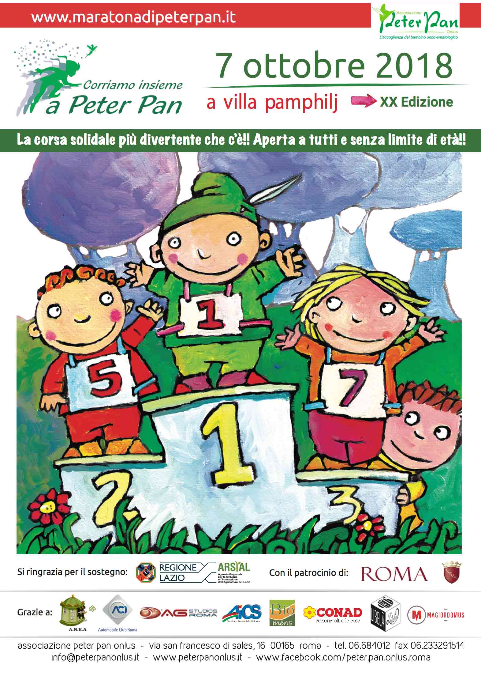 Ci siamo, è in arrivo la VENTESIMA EDIZIONE di “Corriamo insieme a Peter Pan“ la corsa non competitiva per adulti e bambini nella storica sede di Villa Pamphilj. Peter Pan vi aspetta il 7 ottobre per una giornata di festa, sport e solidarietà a sostegno della Grande Casa dei bambini e degli adolescenti malati di cancro in cura a Roma che ospitiamo gratuitamente con le loro famiglie.