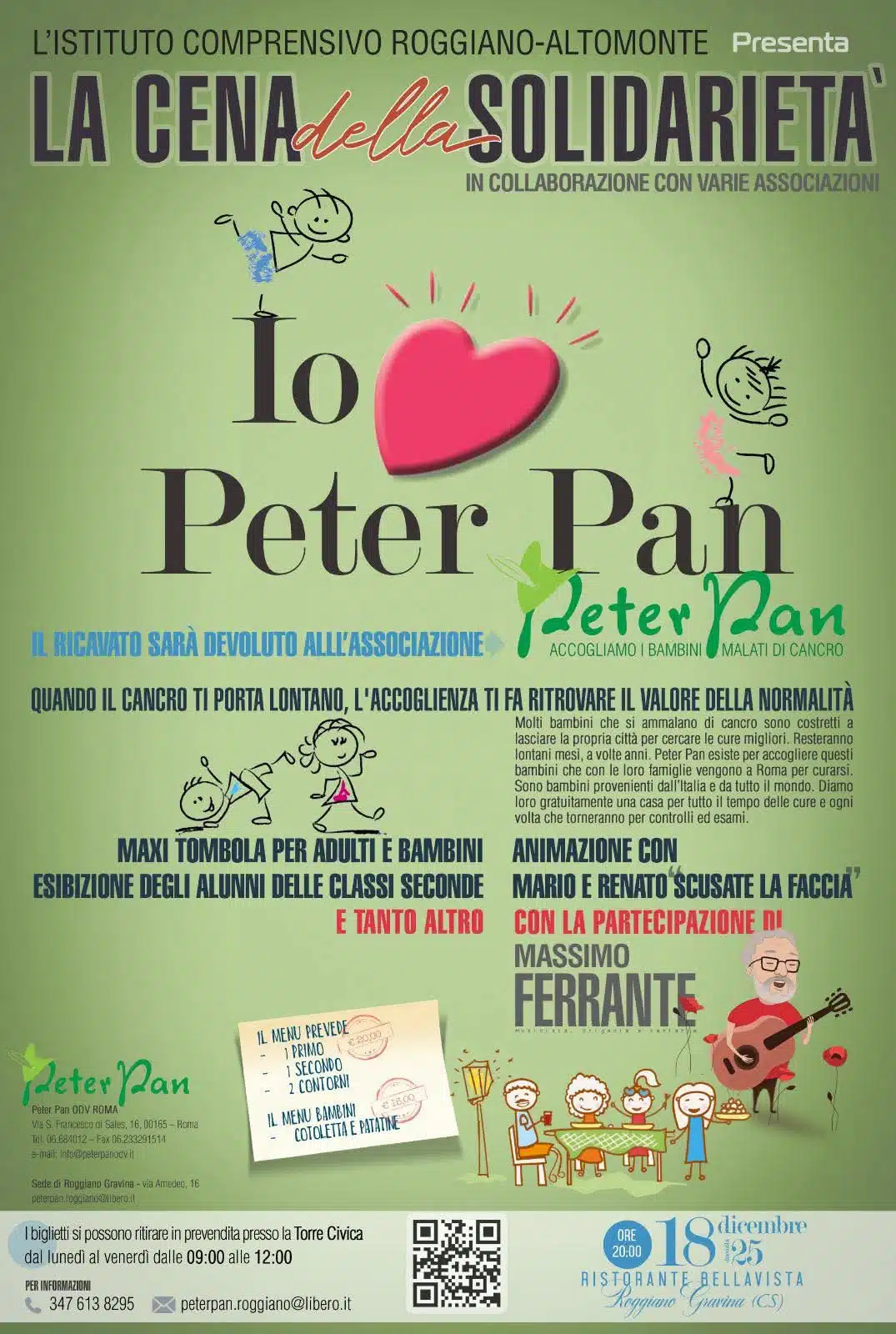 Una grande serata dedicata alla comunitĆ scolastica dellāIstituto Comprensivo Roggiano-Altomonte, con tombola per adulti e bambini, animazione, musica dal vivo e lāesibizione degli alunni delle classi seconde. Il ricavato della cena sarĆ devoluto interamente a sostegno delle famiglie accolte da Peter Pan ODV. Un evento ricco di partecipazione, creativitĆ e calore, pensato per trasformare una serata insieme in un gesto di accoglienza autentica.