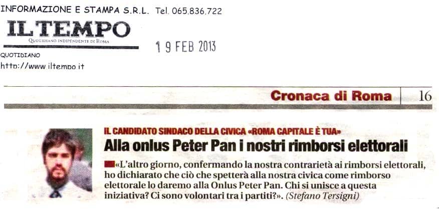 Alla onlus Peter Pan i nostri rimborsi elettorali…