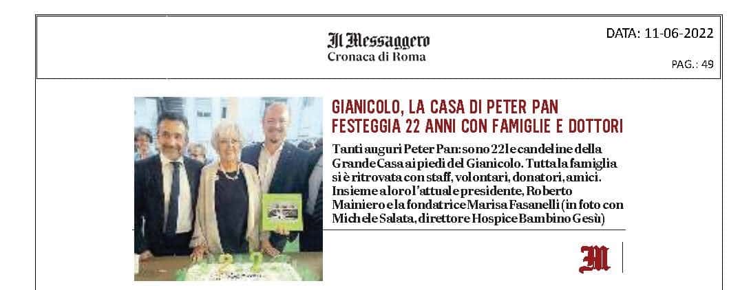 Articolo uscito sul Messaggero di Roma dell’11 giugno relativo ai festeggiamenti per i 22 anni di accoglienza a Peter Pan nella Grande Casa al Gianicolo.
